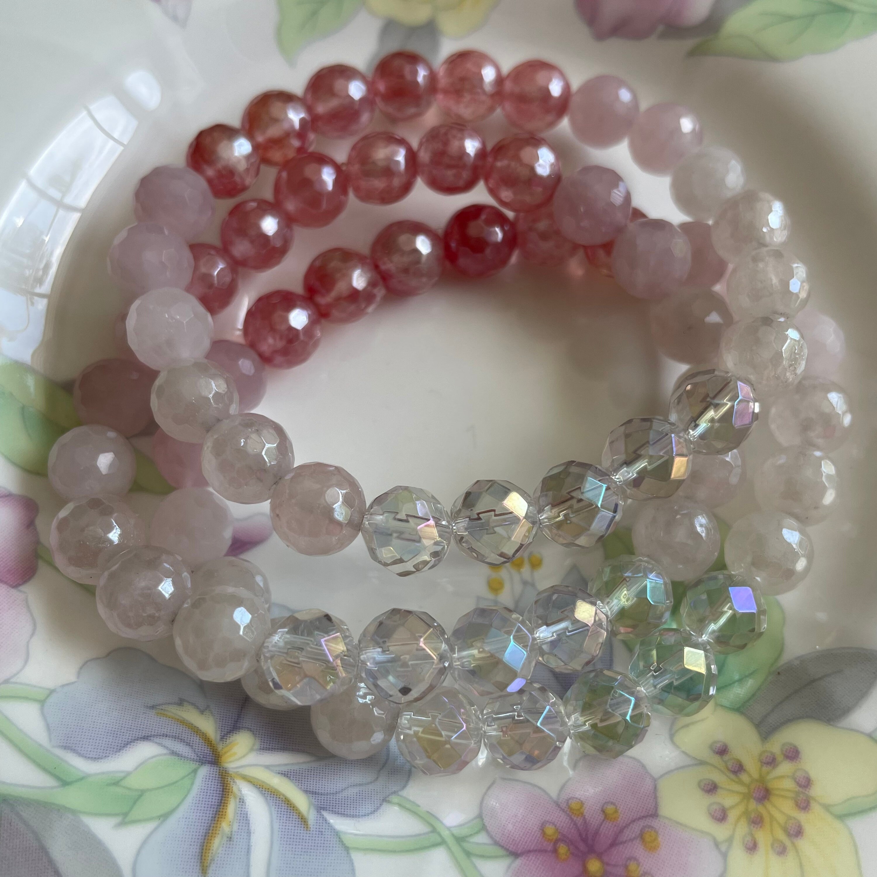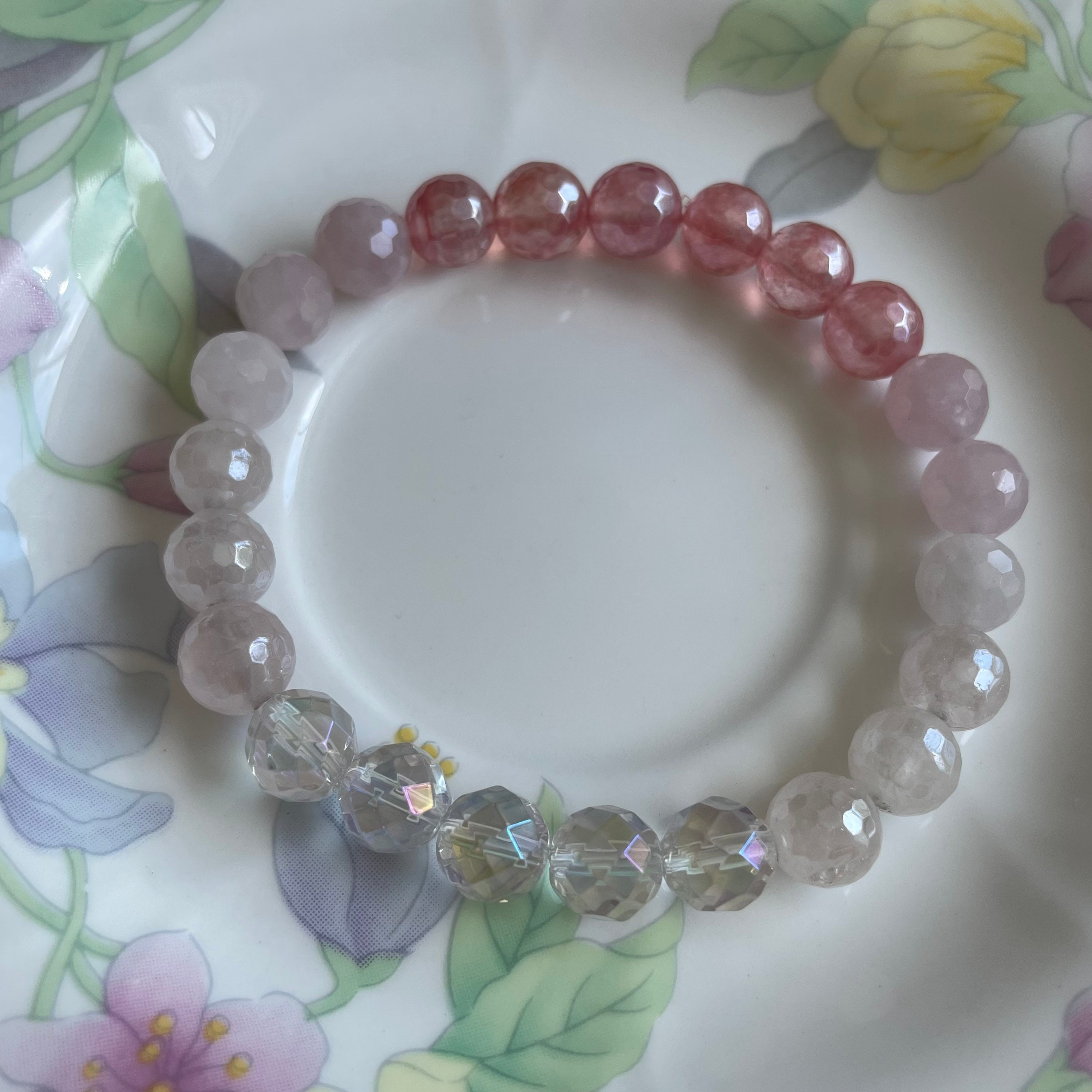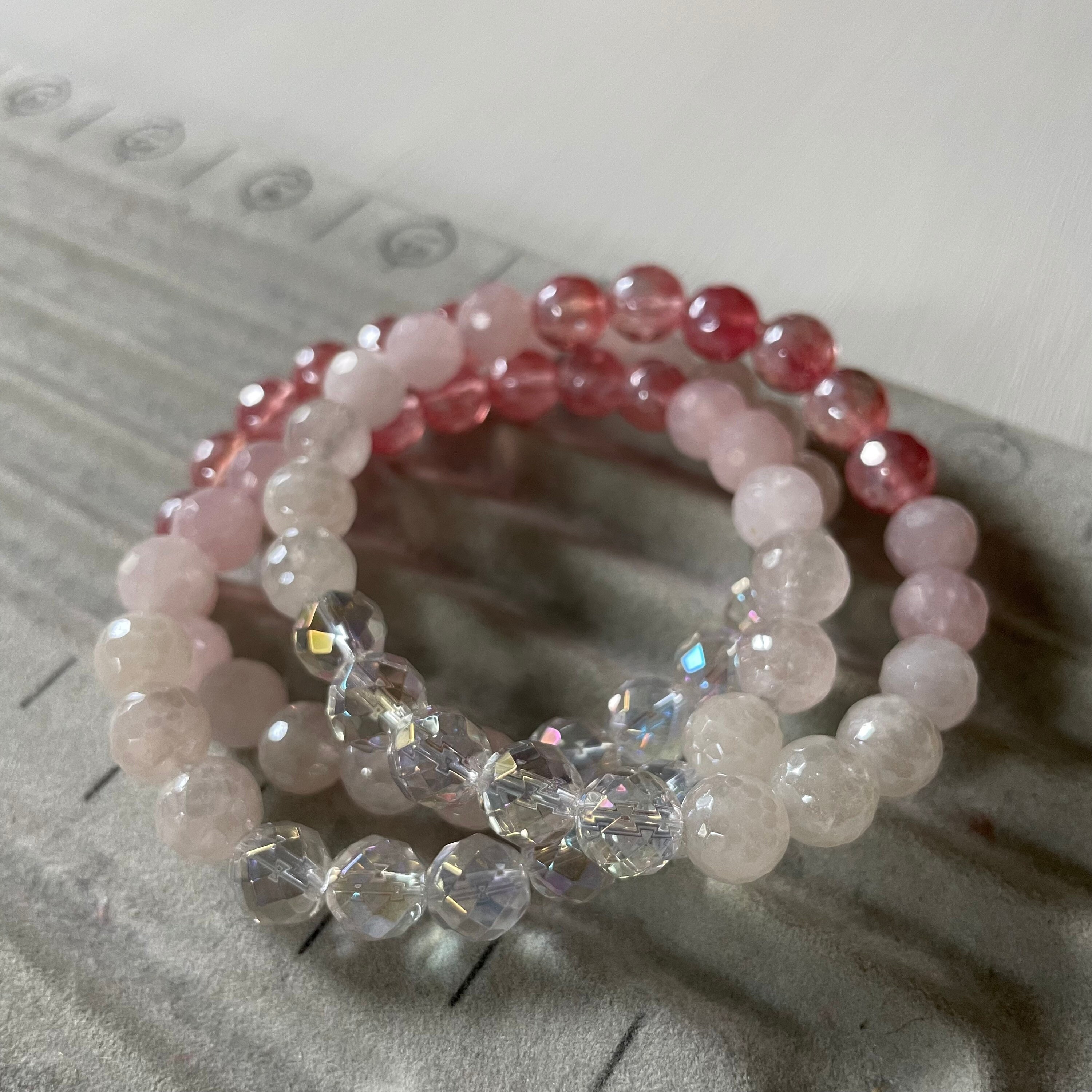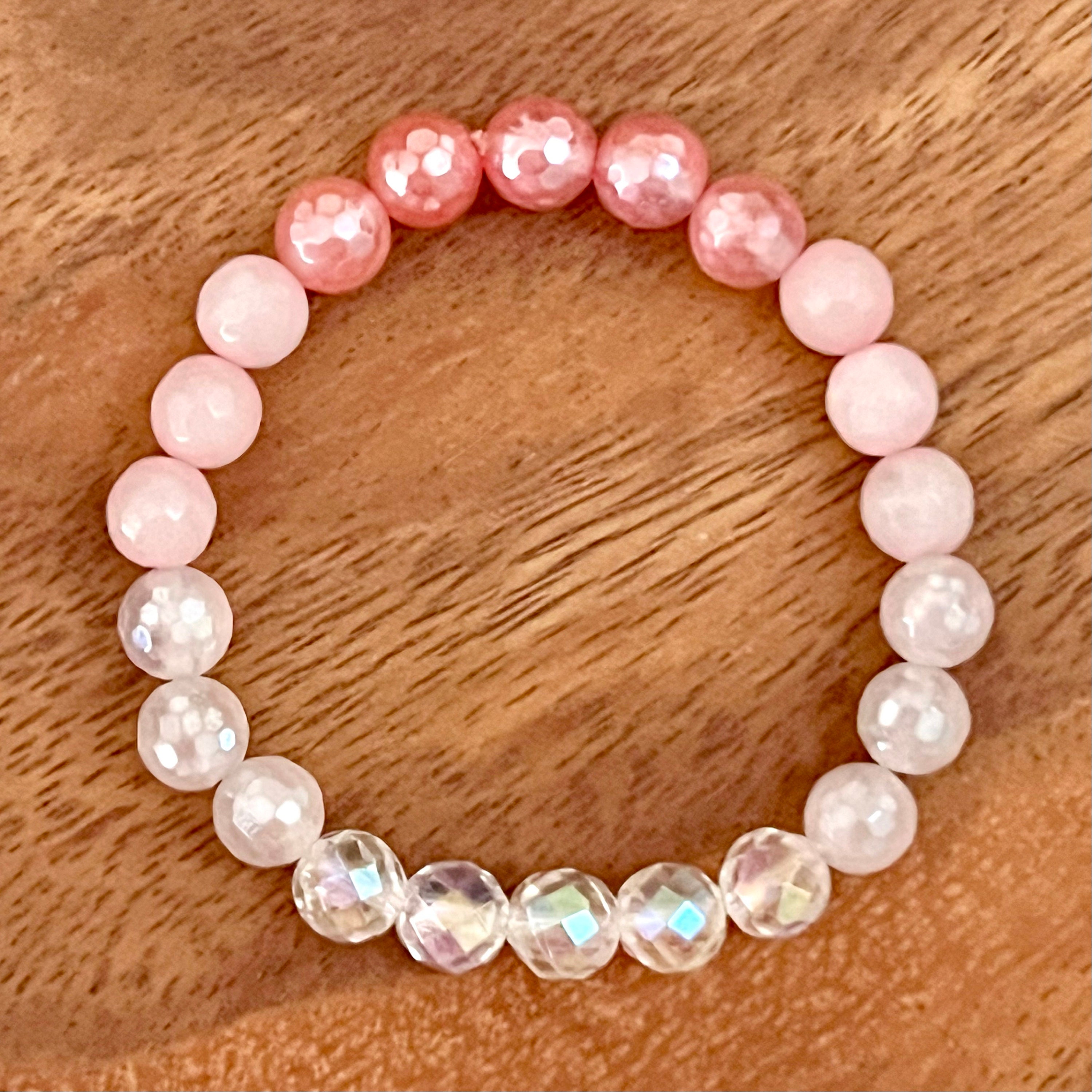 Rich and feminine, this ravishing bracelet touches my soul so deeply with its glorious heart-opening energy and glistening, shimmery stones. Every crystal is pure perfection. The mystic hot pink quartz looks like rosy pink pearls and is gorgeous with the aura quartz and other crystals. Effortlessly beautiful stacked with all my other Spiritual Junkies bracelets which I can’t stop buying! Loooove this so much 💖🌸🍃
