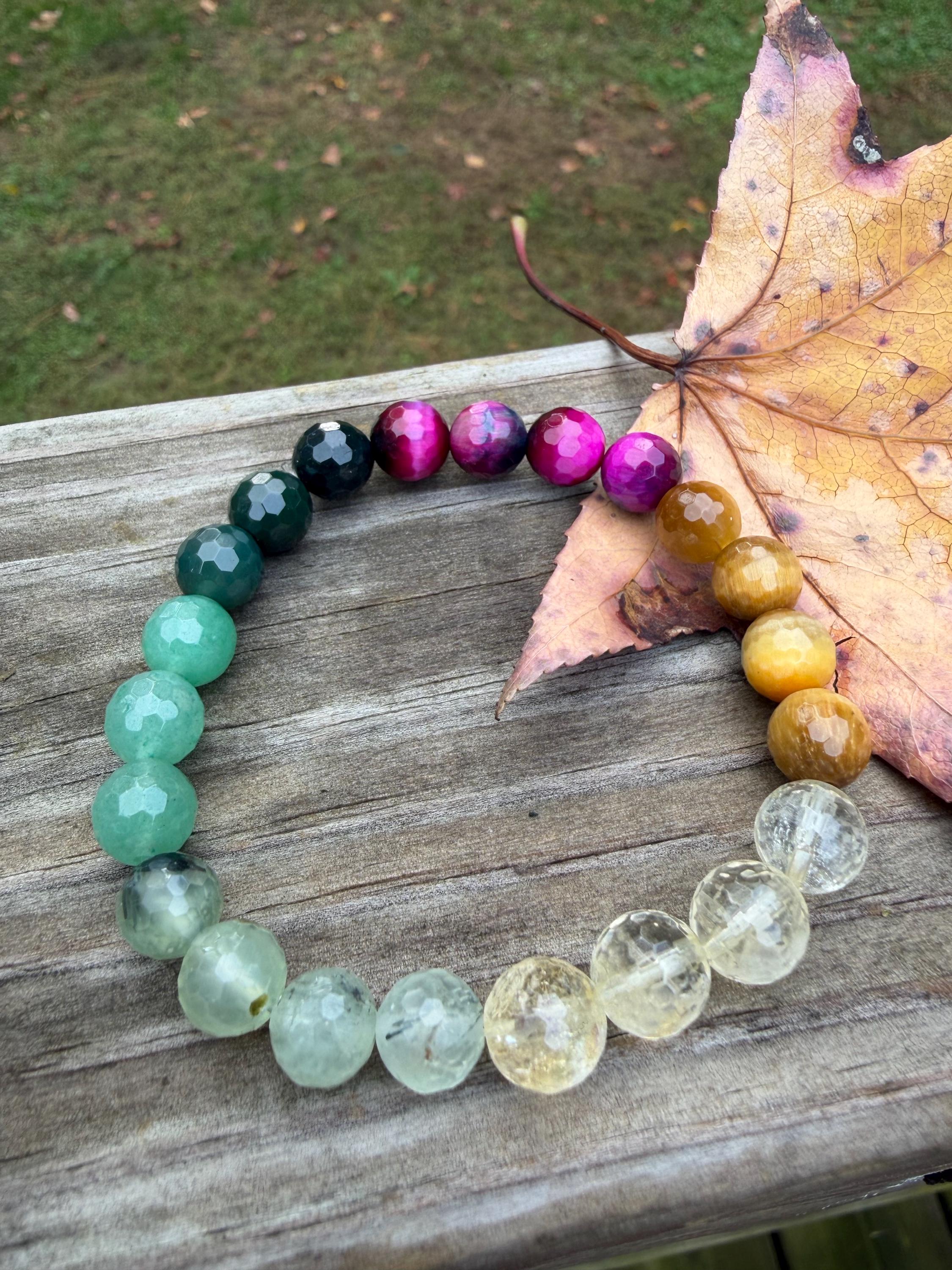 Moss Agate, Pink Galaxy Tiger Eye, Blond Tiger Eye, Citrine, Prehnite + Aventurine