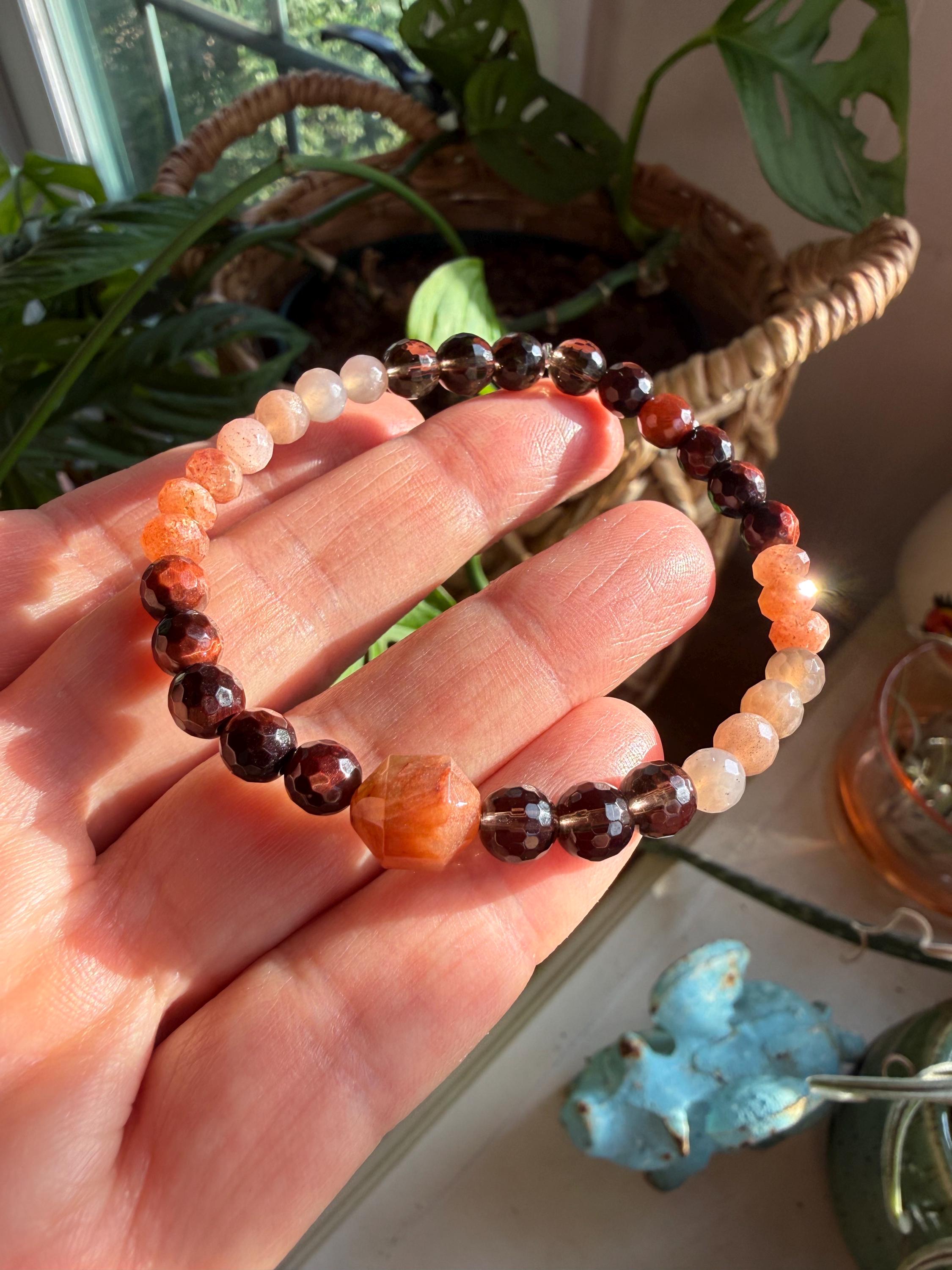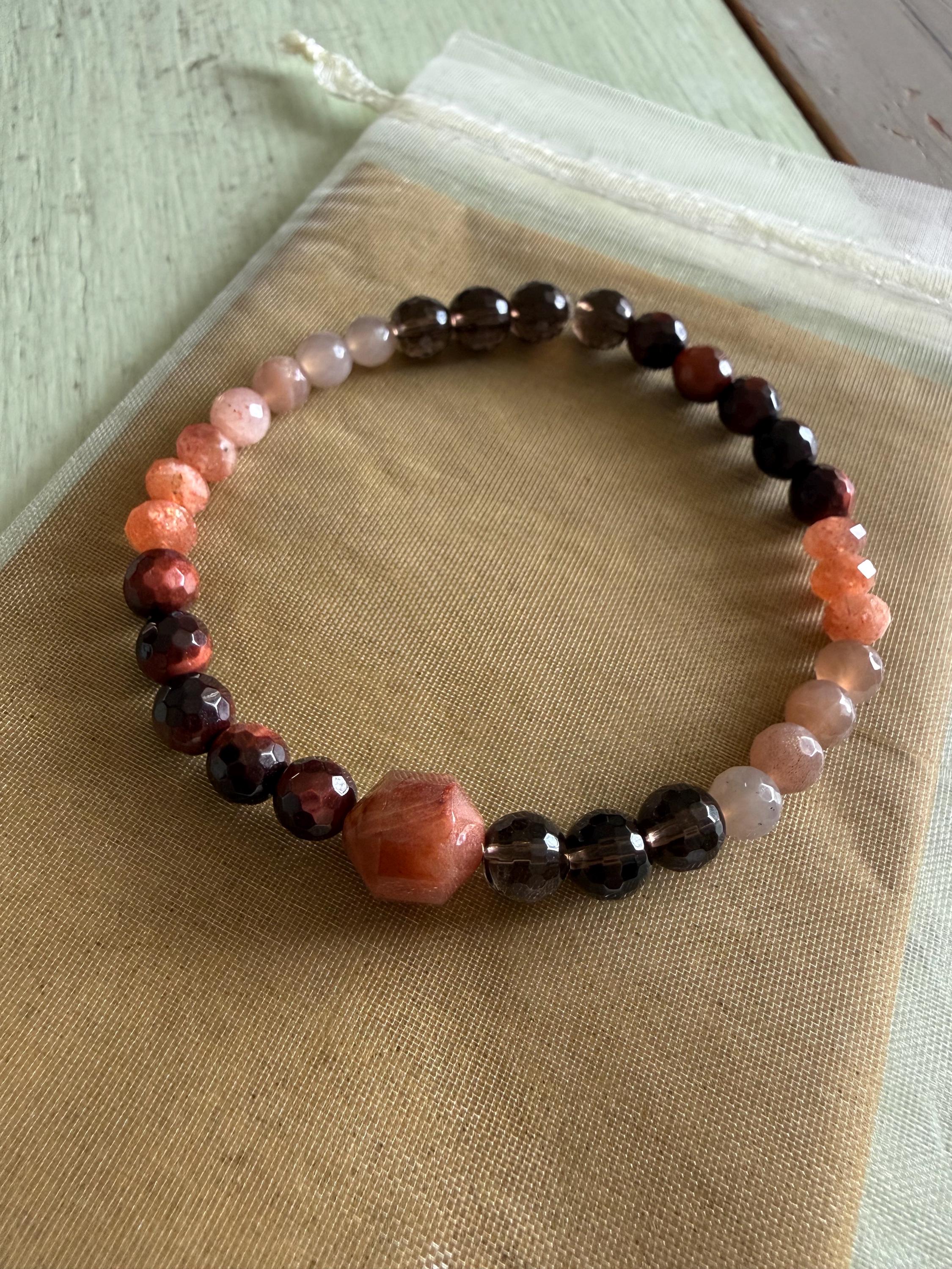 Smoky Quartz, Lodolite, Red Tiger Eye, + Sunstone